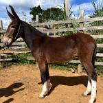 Mula CASTANHO TOSTADO e das 4 PATAS CALÇADAS, com apenas 16 meses, mostrando muito potencial e excelente andamento. Excelente morfologia e tamanho de orelhas. Uma mula de patrão, da prateleira de cima! Já com 1,38 de cernelha, é filha de GRAFITE DO BANDEIRA, Jumento Nacional, em mãe Mangalarga Marchador.